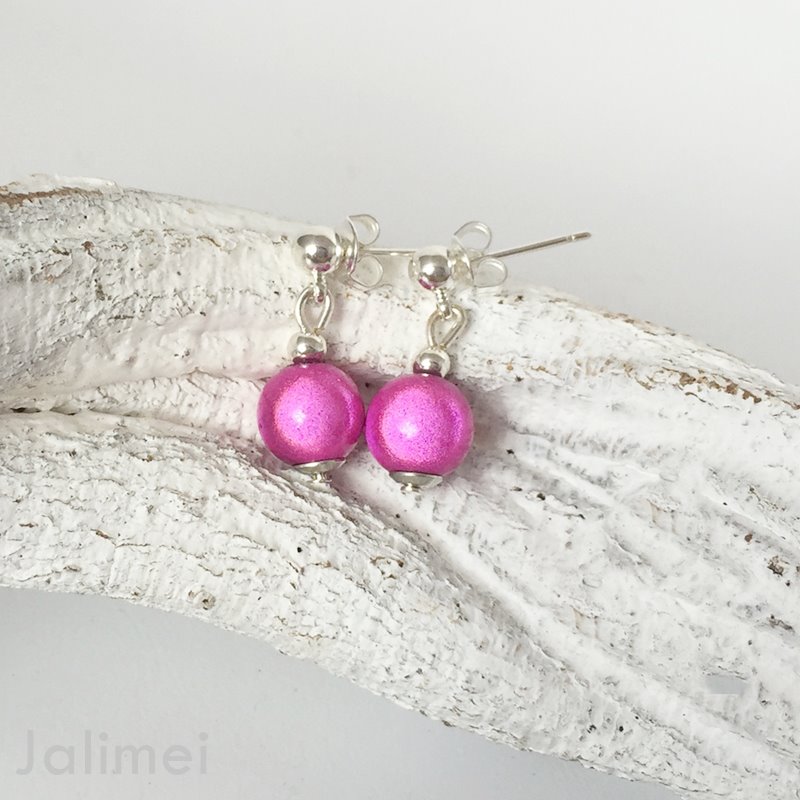 Ein Paar Ohrstecker mit einer hängenden pinken Miracle Bead Perle in einer Stärke von 8mm.