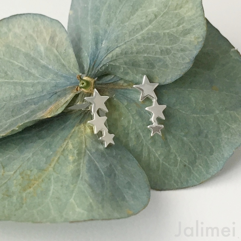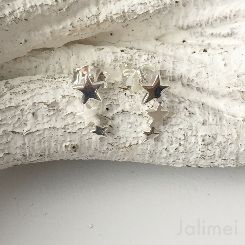 Süsse Ohrstecker mit 3 Sternchen aus 925er Sterlingsilber. Die Sternchen sind untereinandergesetzt, der obere und untere Stern ist glänzend, der mittlere matt.