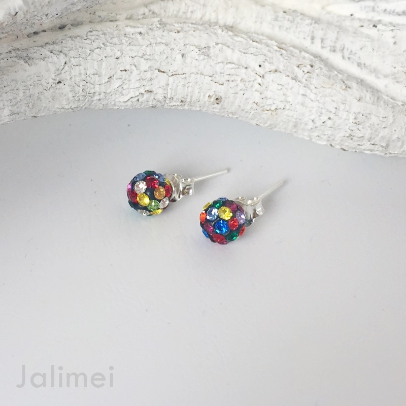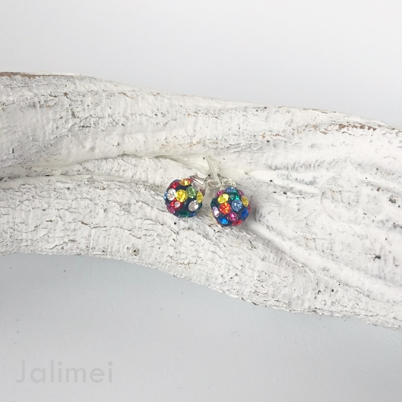 Runder Ohrstecker mit einem Durchmesser von 6 mm, der mit kleinen Straßsteinchen besetzt ist. Hier in der Farbe multi (bunt). Der Stift und die Feder bestehen aus 925er Silber.