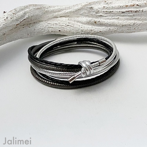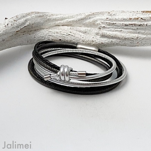 Dieses raffinierte Wickelarmband Knoten schwarz-silber besticht durch seine Eleganz! Es wurde ein 4 mm starkes Nappalederband in einem anthrazit metallic verarbeitet. Ausserdem sind ein 2,5 mm starkes Nappalederband in silber und ein 2,5 mm starken geflochtenem Lederband in schwarz. Ein Hingucker ist der aus dem Nappalederband angefertigte Knoten, dessen Enden Edelstahlkappen zieren.