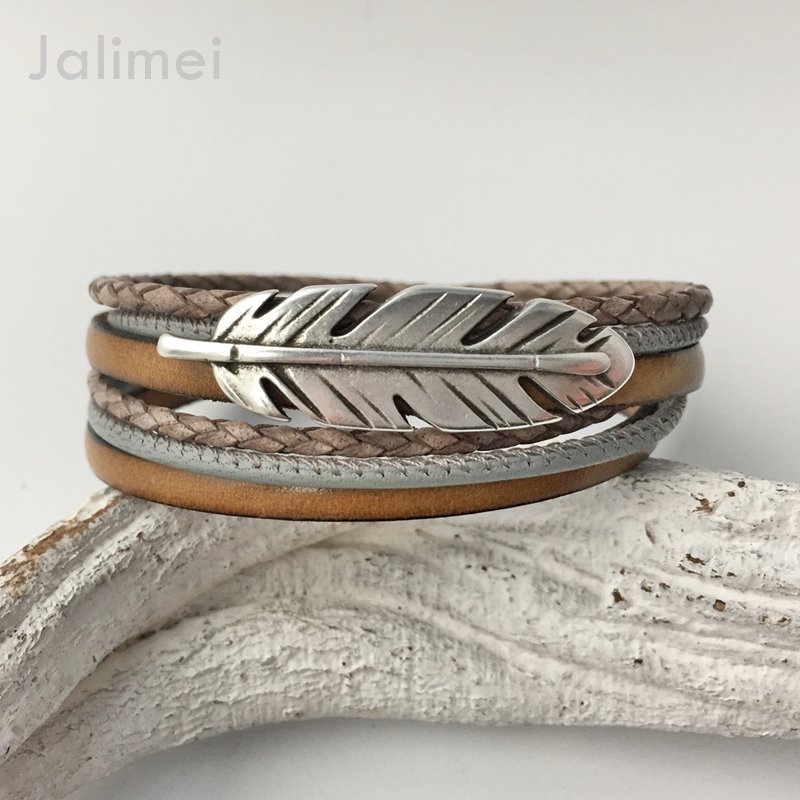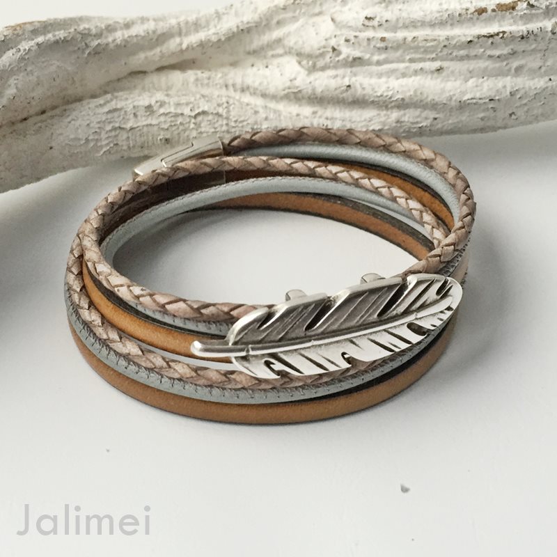 Wickelarmband aus 3 Lederbändern in den Farben beige und grau mit einem Metallschieber Feder. Geschlossen wird das Armband mit einem nickelfreien Magnetverschluß.
