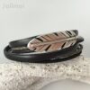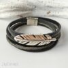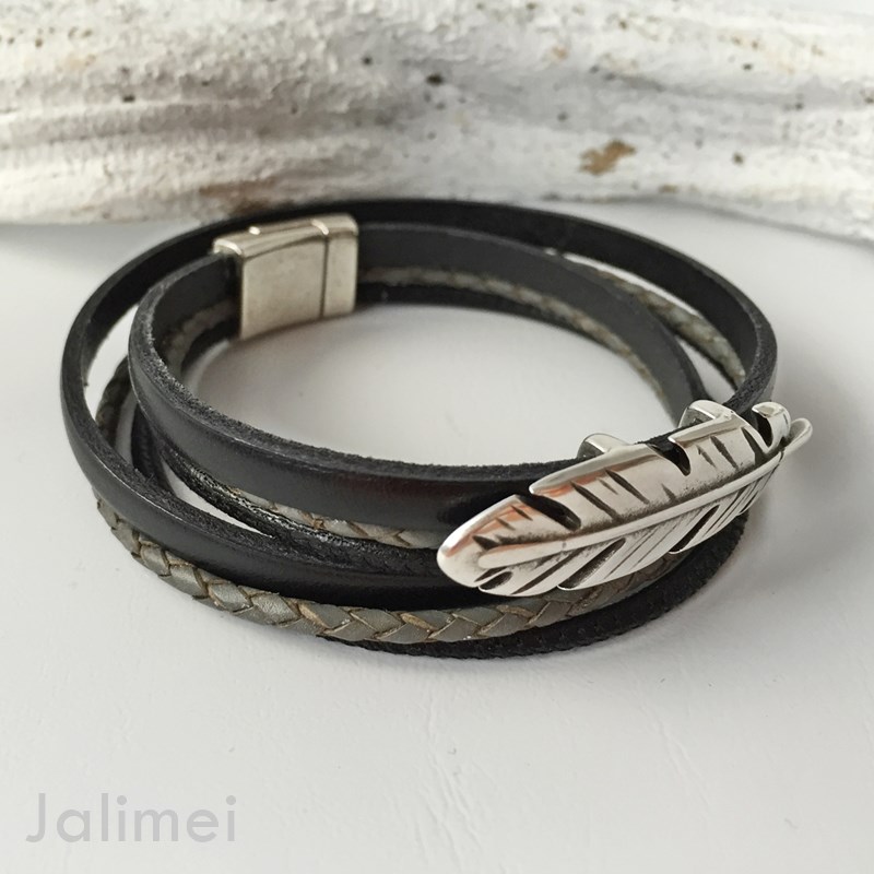 Wickelarmband aus 3 Lederbändern in den Farben schwarz und grau mit einem Metallschieber Feder Geschlossen wird das Armband mit einem nickelfreien Magnetverschluß.