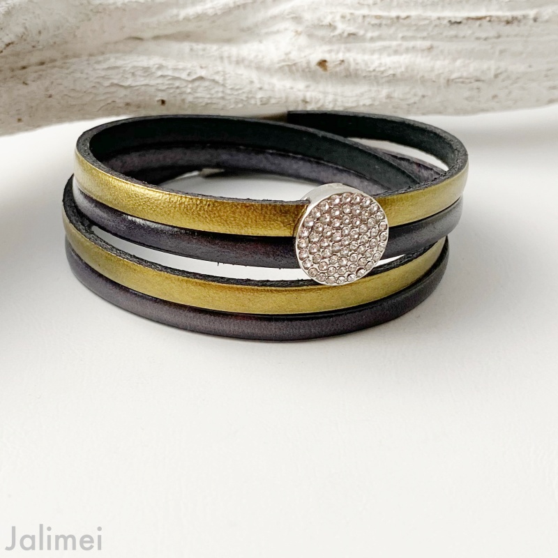 Das Wickellederarmband Glitzerstein gold anthrazit ist ein sehr edles Schmuckstück! Es wurden zwei flache ca. 5 mm breite Lederbänder verarbeitet und mit einem runden mit Strasssteinchen besetzten Schieber (ca. 14 mm) aufgepeppt.