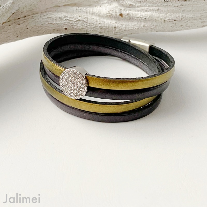 Das Wickellederarmband Glitzerstein gold anthrazit lässt sich mit Hilfe eines hochwertigen Edelstahl-Magnetverschlusses leicht an- und ablegen.